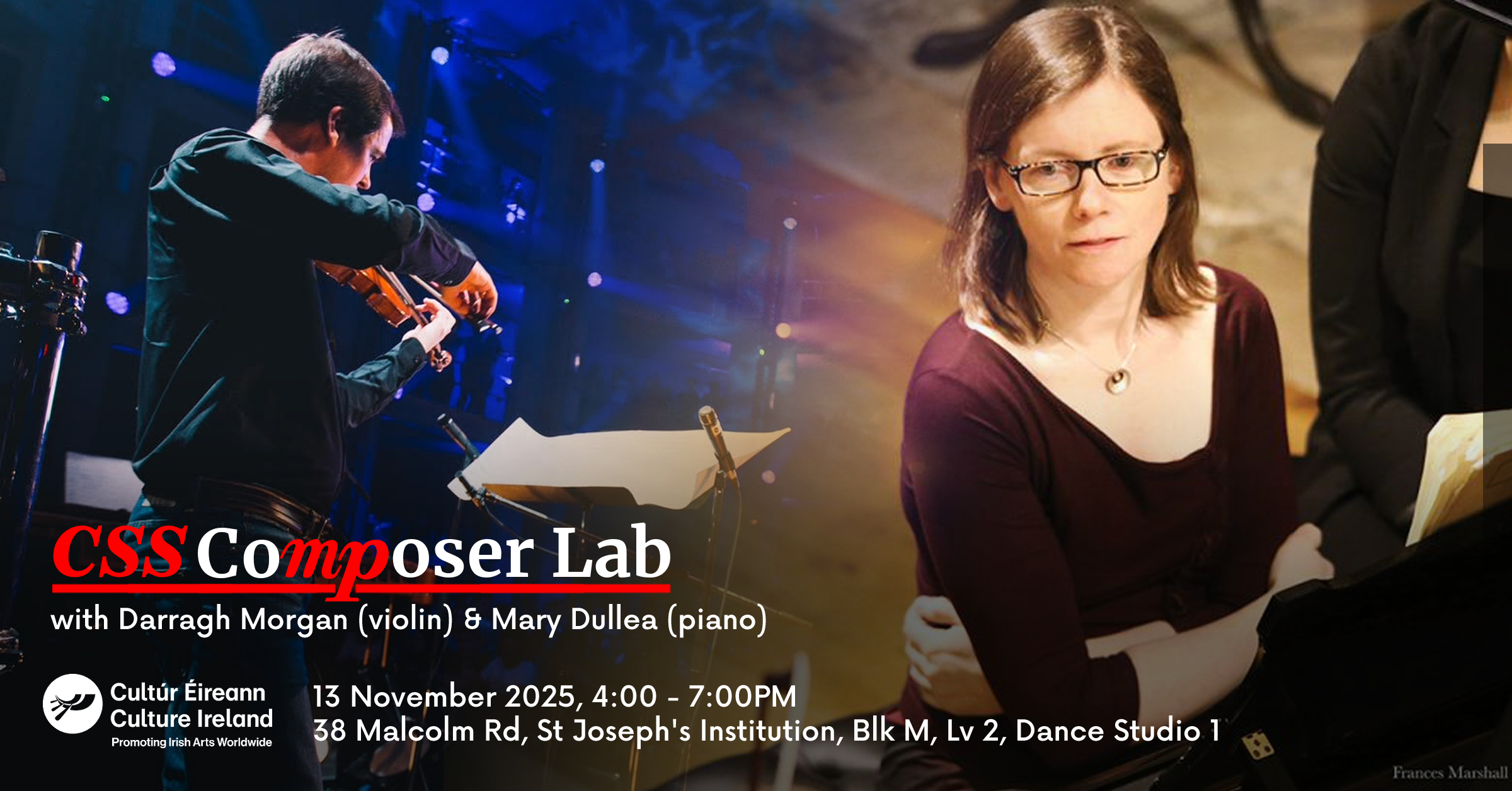 The session will consist of a score reading of works by CSS composers for solo violin, solo piano, or violin and piano, followed by a talk and performance of new music from Ireland. The workshop is a rare opportunity to hear from leading musicians, Dr Morgan and Professor Dullea, about composition techniques, ideas, and styles for the violin, piano, electronics, and more. We invite everyone interested in composition to sit in on the workshop to observe for learning and exposure.